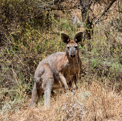 The walk starts easy along a broad path and dried out riverbeds. It is beautiful, big red gum trees, narrow passages, grassy hills, and gorgeous views. Wallaroos and kangaroos everywhere, looking at us curiously before they jump away.