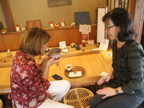 Ingen besøk i Japan uten å drikke grønn te på den sermonielle måte. Vi deltok på en tradisjonell tesermoni i Kyoto, mer kommer senere. Her får jeg en liten lesksjon i tedrikking av guiden vår, Koko. Vi beesøkte et koselig lite tehus i Yanak Reien.